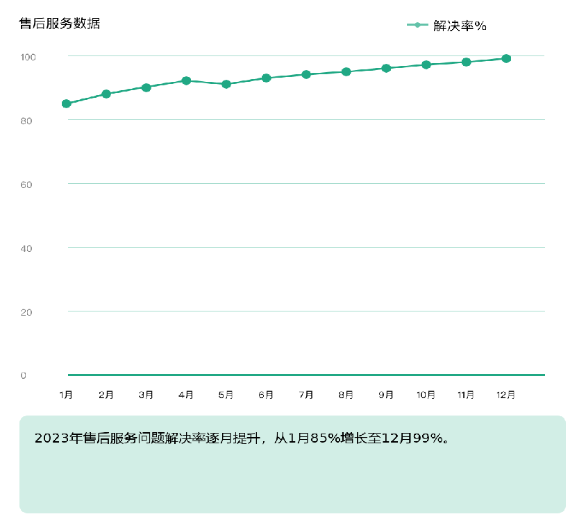 2023年售后服務(wù)問題解決率逐月提升,從1月85%增長至12月99%,顯示出持續(xù)改進的成效。